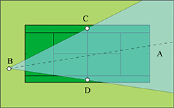 Un calcul plus savant permet d'évaluer l'erreur commise ainsi, et d'en tenir compte. Suivant la zone où se trouve celui qui doit renvoyer la balle, une correction est nécessaire. La figure de droite permet de visualiser l'erreur d'approximation : moins de 50 cm dans la partie claire jusqu'à plus de 2 m dans la foncée. Les courbes sur la figure sont des cercles de même axe : le filet.