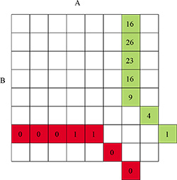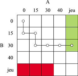 Au tennis, les règles du jeu sont faites pour amplifier les différences. Pour comprendre comment, imaginons un match entre deux joueurs A et B. Supposons que, pour chaque balle, A ait 60 % de chance de gagner. Quelle est la probabilité qu'il gagne un jeu ? Qu'il gagne un set ? Qu'il gagne le match ? Pour répondre à cette question, il est nécessaire de connaître la façon étrange de compter les points au tennis : 0, 15, 30, 40, puis avantage ou égalité et jeu. Cet algèbre bizarre cache une règle plus simple : il faut gagner au moins quatre balles, avec deux d'écart sur son adversaire, pour gagner le jeu. Avec cette règle, les déroulements possibles d'un jeu sont limités. Tout part du score 0–0 pour arriver au gain du jeu par l'un ou l'autre.