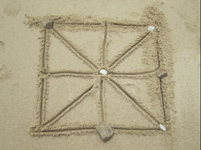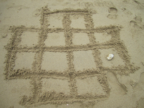 Pour commencer, cherchez trois galets clairs et trois galets foncés. Tracez le plateau de jeu dans le sable : un carré, ses diagonales et ses médianes. Chaque joueur dispose à tour de rôle ses pions aux intersections de la grille. Si aucun n'a réussi à aligner ses trois pions, le jeu se poursuit en déplaçant, à tour de rôle, un pion de sa couleur en suivant les lignes de la grille. Trouvez-vous une stratégie gagnante ? Si chaque joueur trouve un pion de plus sur la plage, un autre jeu (plus subtil qu'il n'en a l'air) est possible : le Teeko. La grille de jeu est constituée d'un carré de vingt-cinq cases. Le but de ce jeu, créé par le magicien américain John Scarne (1903-1985), est d'aligner ses quatre pions ou de les disposer en petit carré. Chacun pose ses pions à tour de rôle, comme bon lui semble. Si la partie n'est pas encore gagnée, elle se poursuit en déplaçant chacun son tour un de ses pions sur une case adjacente (horizontalement, verticalement ou en diagonale).