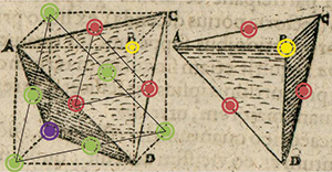 Voici comment Kepler la décrit plus précisément. Il constitue une pyramide en empilant, sur une couche de quinze boulets E, une couche de dix boulets D, puis une couche de six boulets C, une couche de trois boulets B, et enfin un dernier boulet au sommet de la pyramide. De sorte que chaque boulet est casé dans un creux constitué de trois boulets de la couche du dessous.